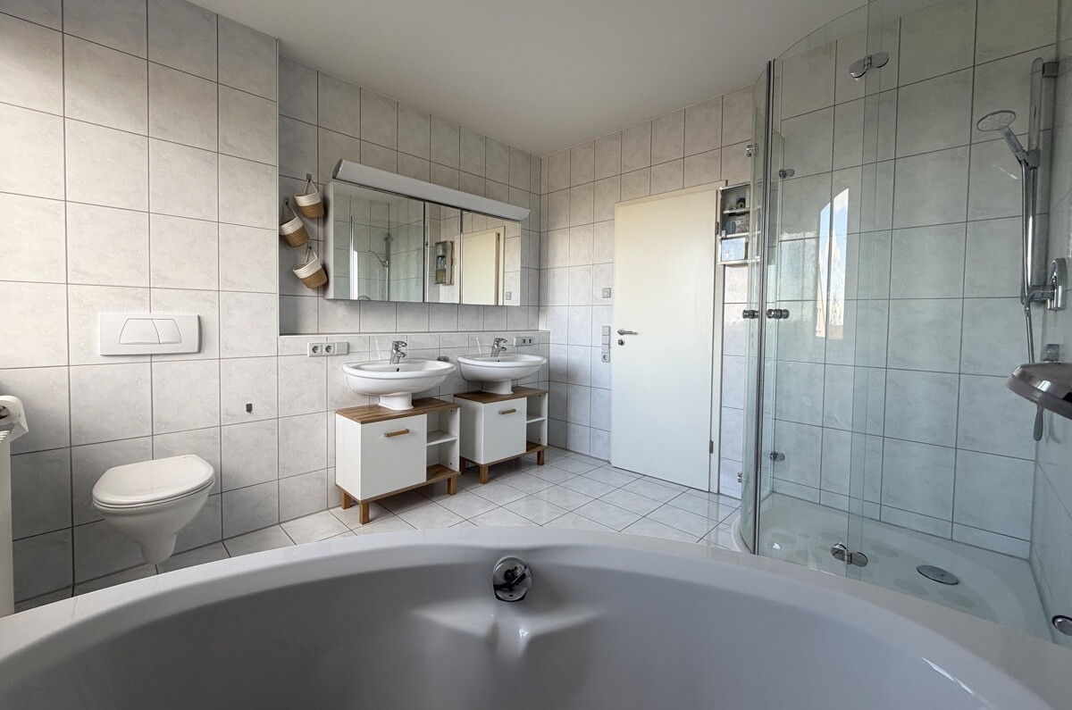 Im großen Tageslichtbad mit Badewanne, Dusche, zwei Waschbecken und einem WC genießt Du eine Kombination aus Funktionalität und SPA-Atmosphäre.