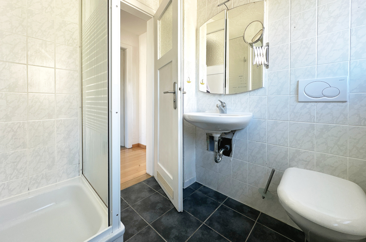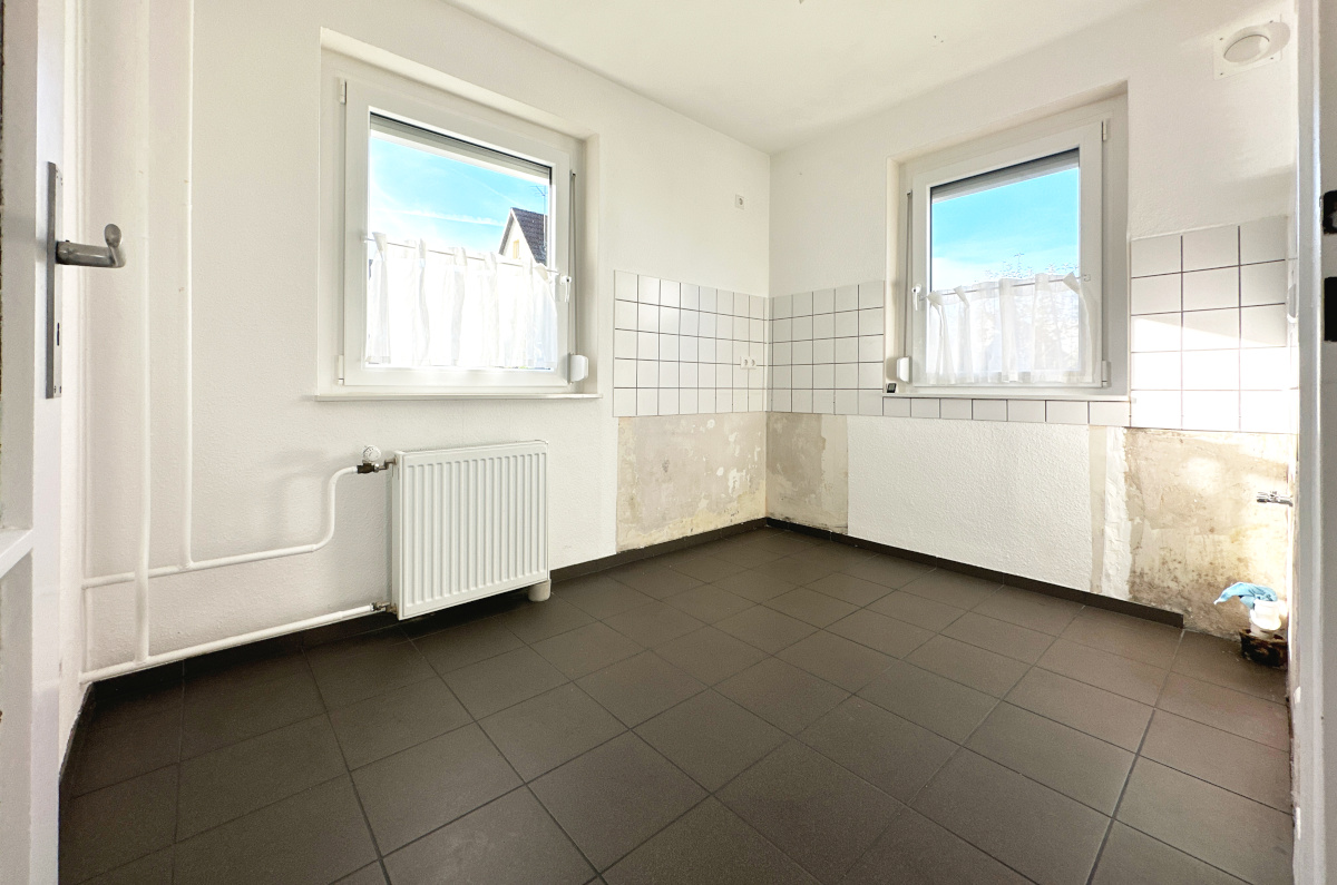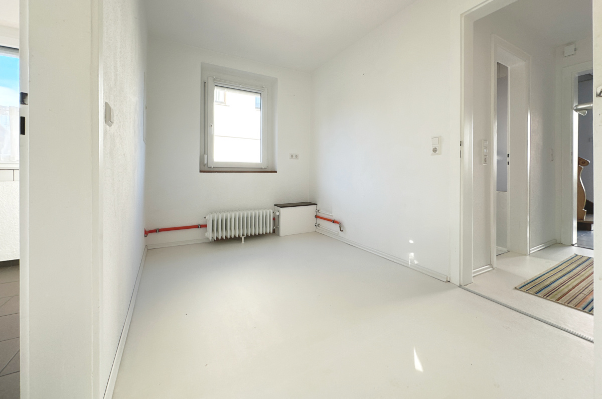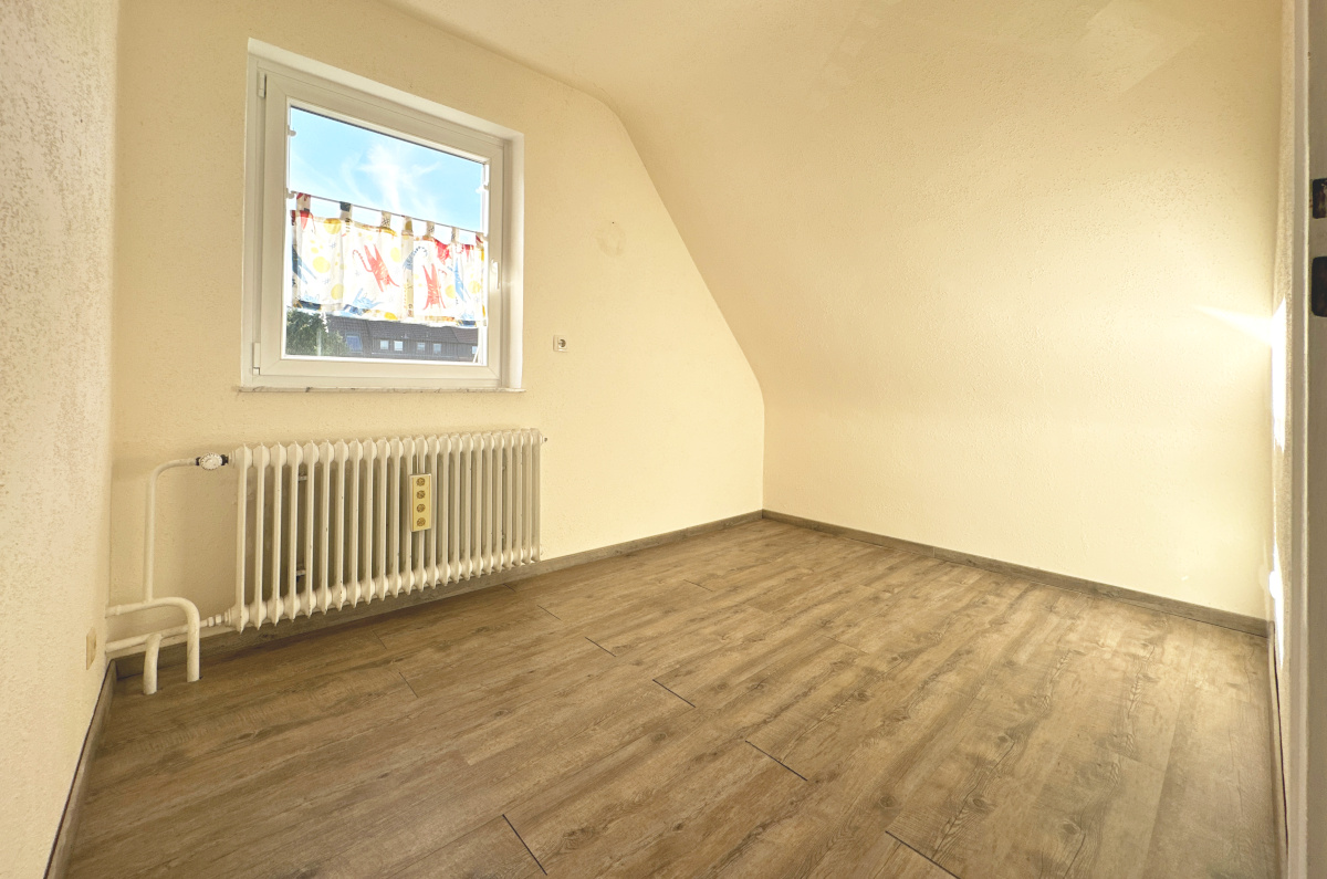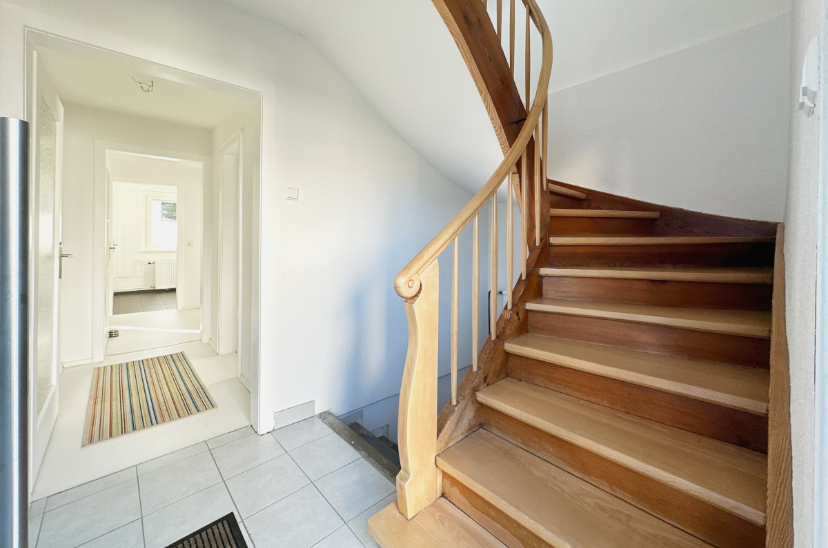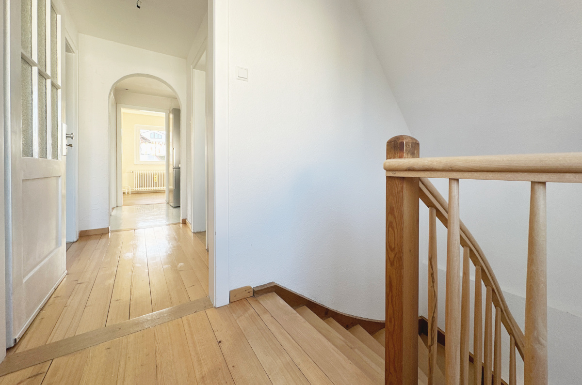 Das Obergeschoss verfügt über drei gut geschnittene Zimmer, eine weitere Küche sowie ein modernes Tageslichtbad. Der Flur verbindet alle Räume und bietet zusätzliche Stellfläche.