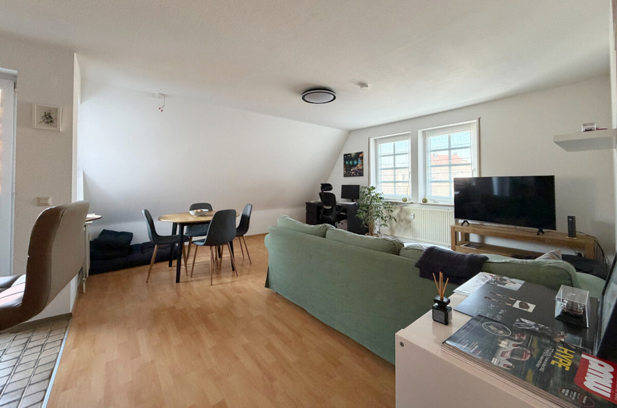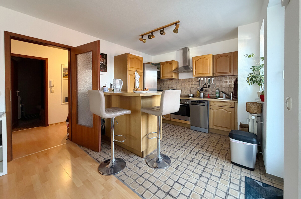 Auf ca. 60 m² Wohnfläche verteilt finden Sie das Herzstück der Wohnung, das große Wohn-/Esszimmer mit angrenzender offenen Küche und Zugang zum Balkon. Von hier blicken Sie über die Dächer von Leonberg.