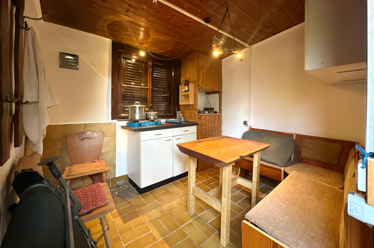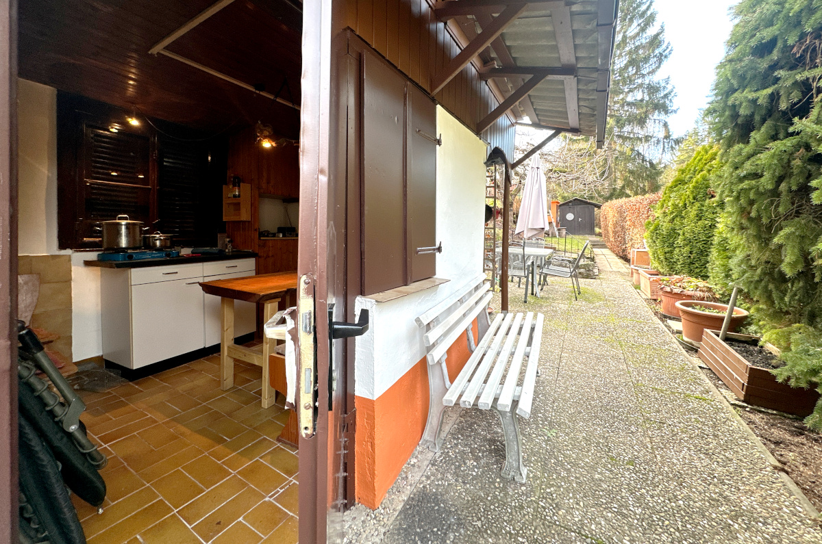 Auf dem Grundstück steht ein gemütliches Minihäuschen mit einer einladenden Sitzecke. Zusätzlich gibt es Wasseranschluss und eine Solarstromversorgung.