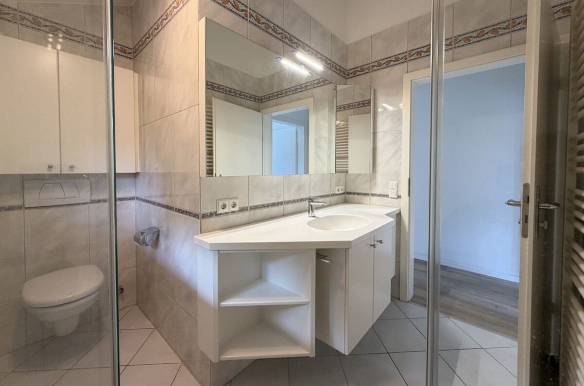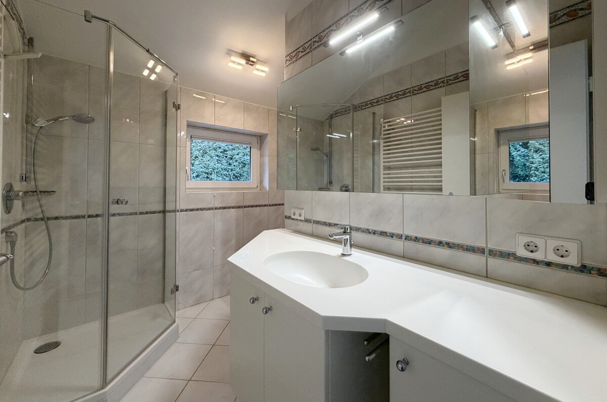 - Tageslichtbad mit Dusche, Waschbecken, Handtuchheizkörper und WC