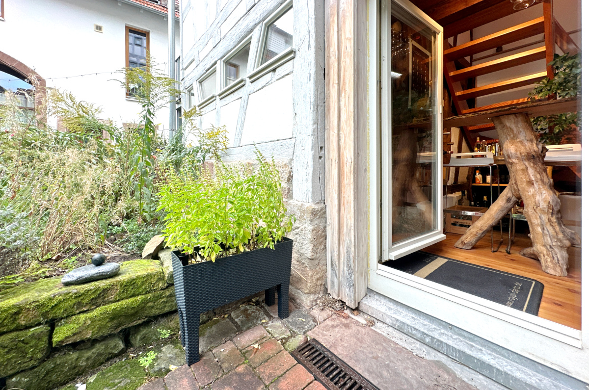 - Wohnbereich mit rustikalen Holzbalken und Zugang zum Innenhof