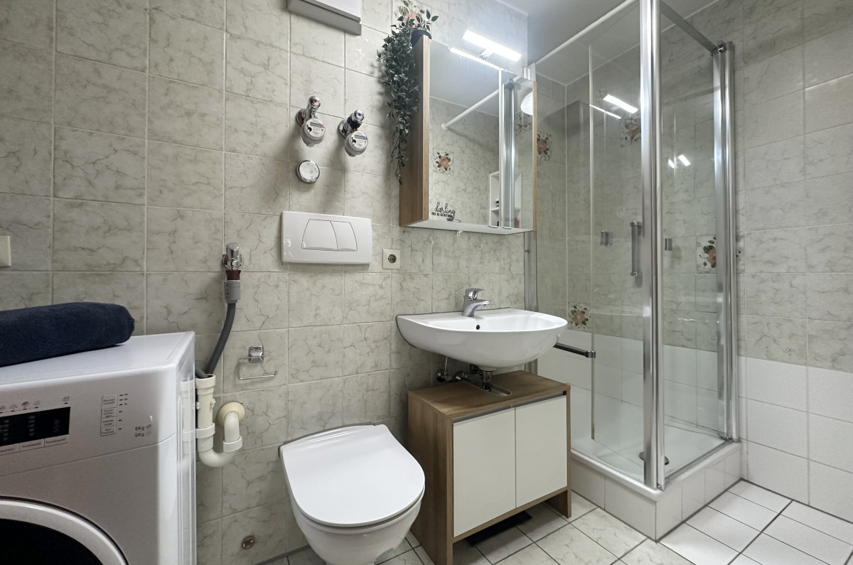 - Badezimmer mit Dusche, Waschbecken und WC - hier befindet sich der Waschmaschinenanschluss